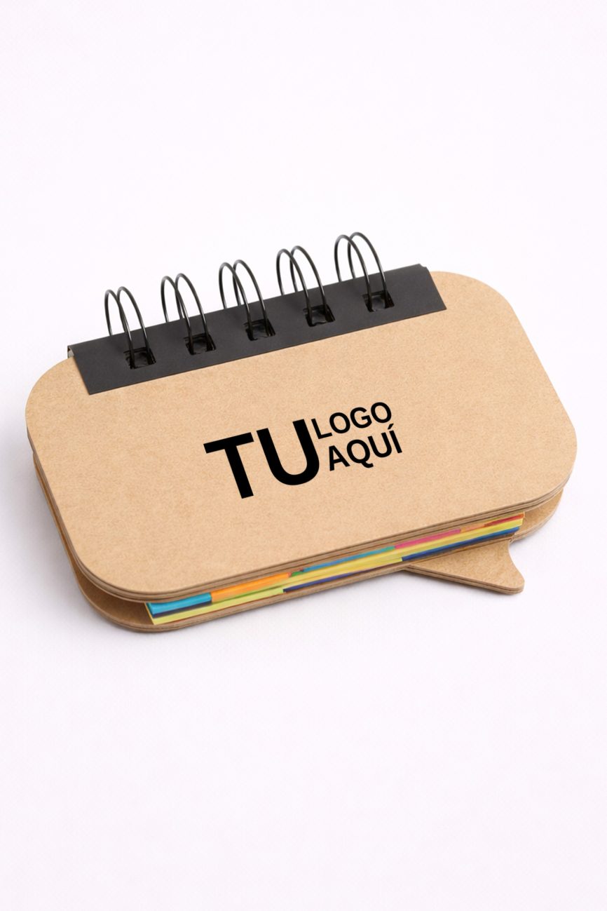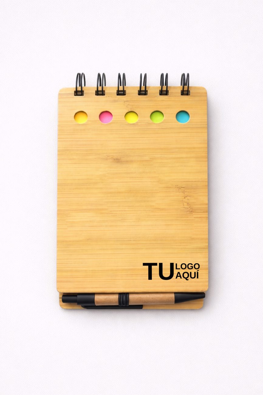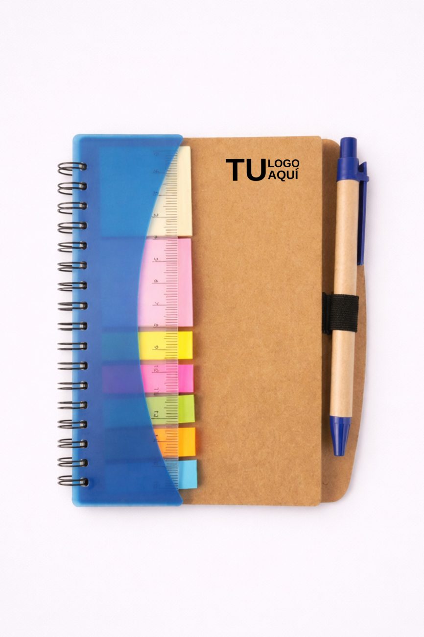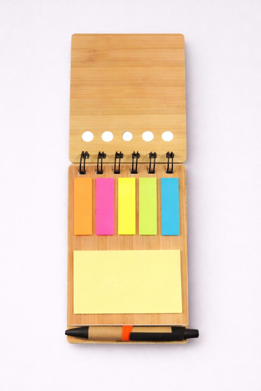 - Descripción: Libreta ecológica que contiene 5 post it medianos de diferentes colores, 1 lapicero ecológico y 70 hojas blancas.
