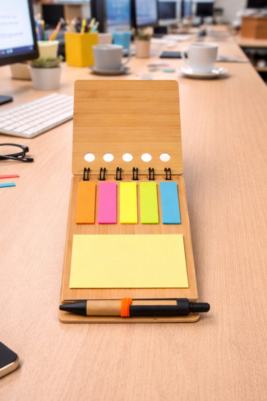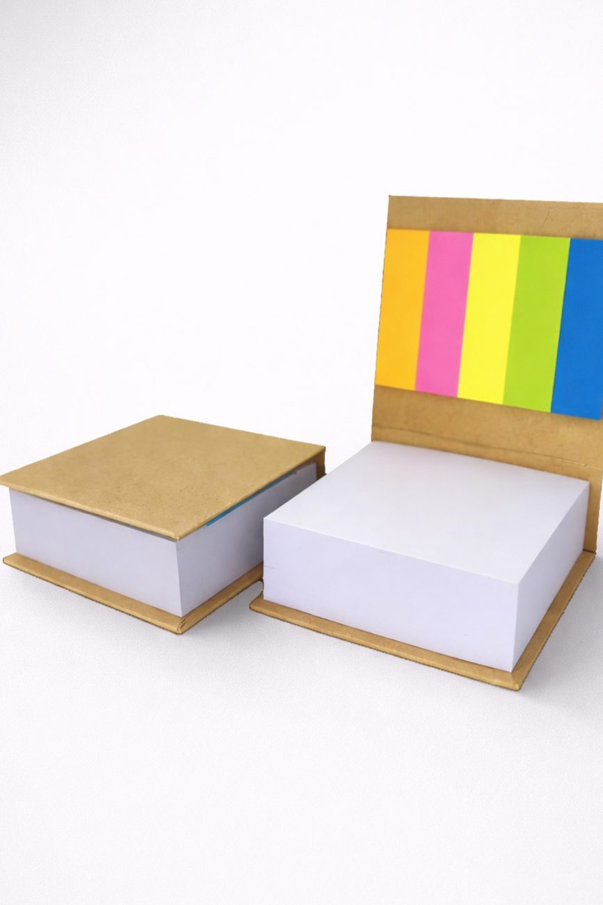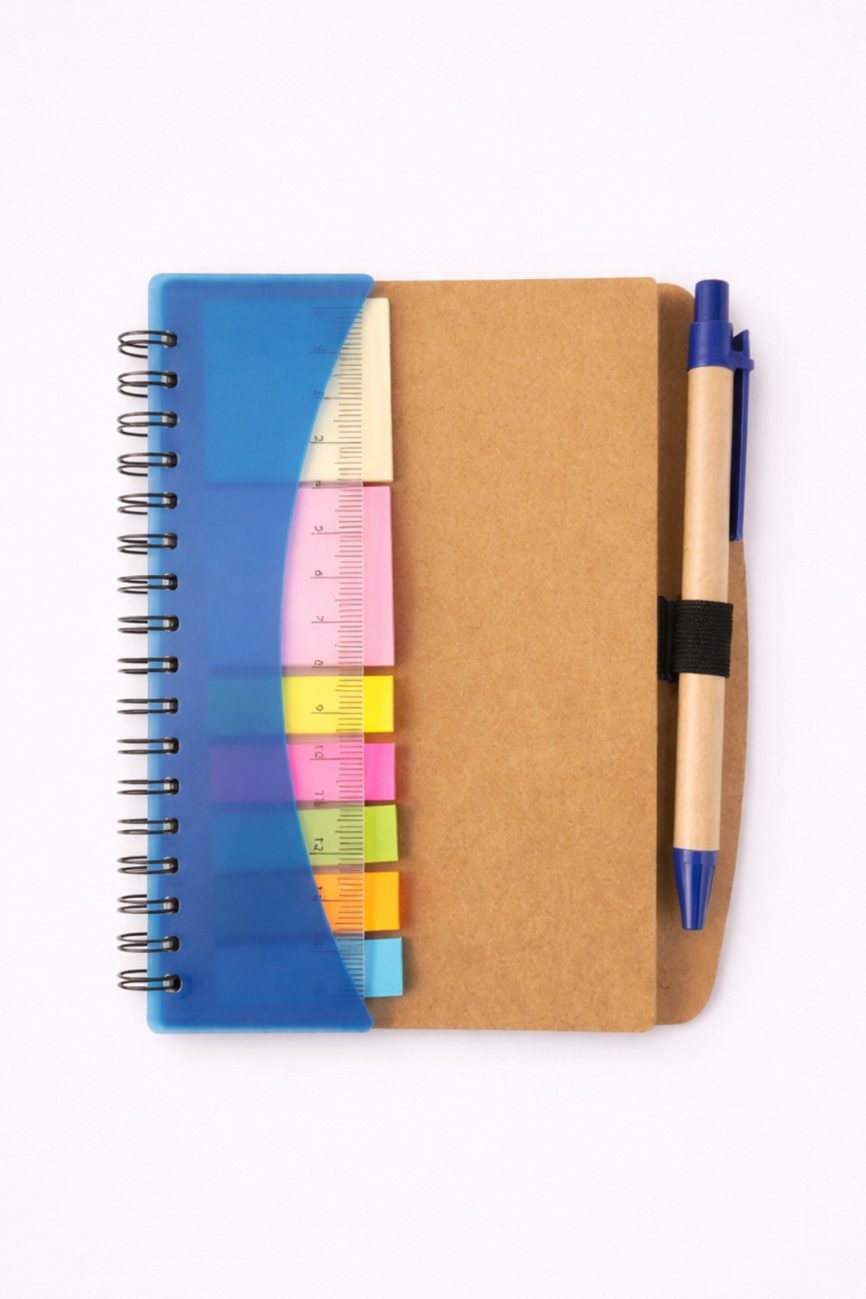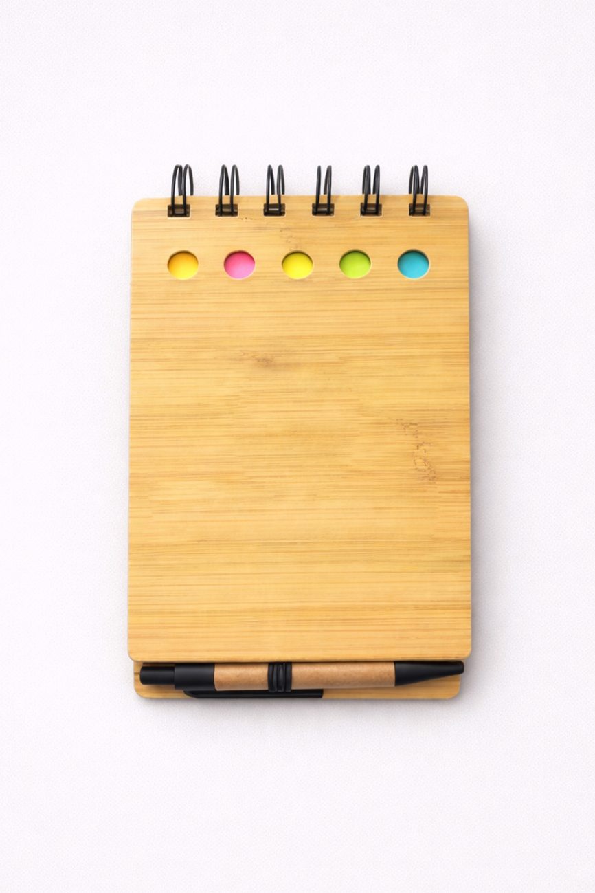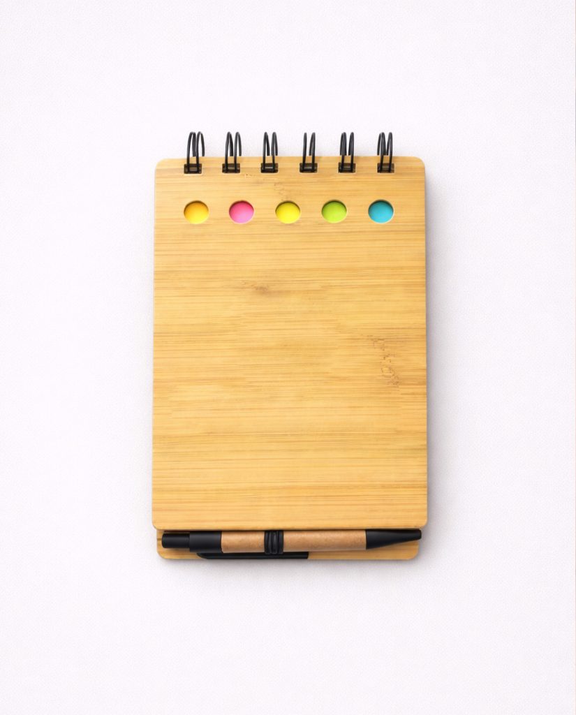 - Descripción: Libreta ecológica que contiene 5 post it medianos de diferentes colores, 1 lapicero ecológico y 70 hojas blancas.